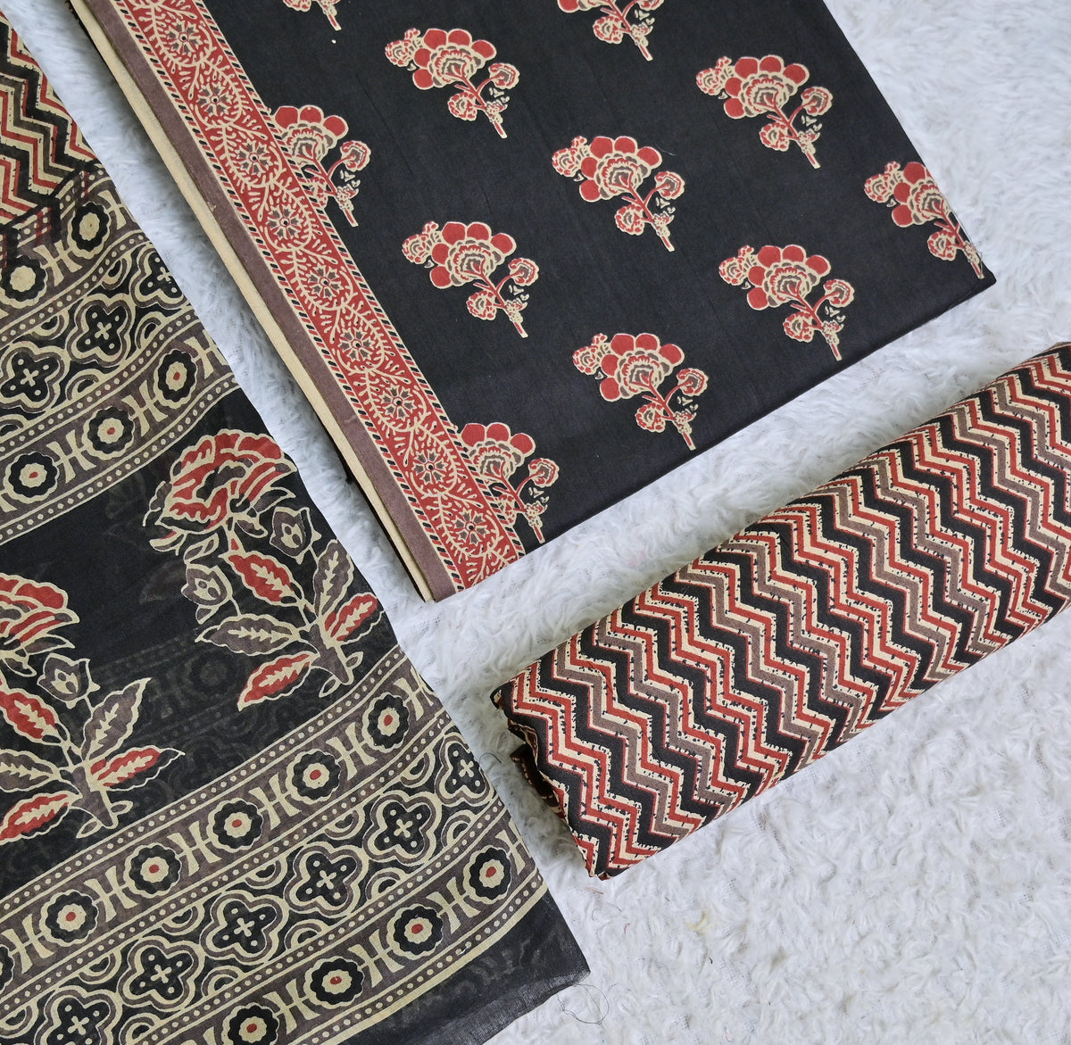 Upgrade your daily ethnic collection with this classic black and rust unstitched dress material. This 3-piece set is crafted from breathable cotton, featuring a timeless combination of floral and geometric patterns. The kurta fabric is designed with elegant rust-toned floral motifs on a deep black base, accented by a detailed floral border.
