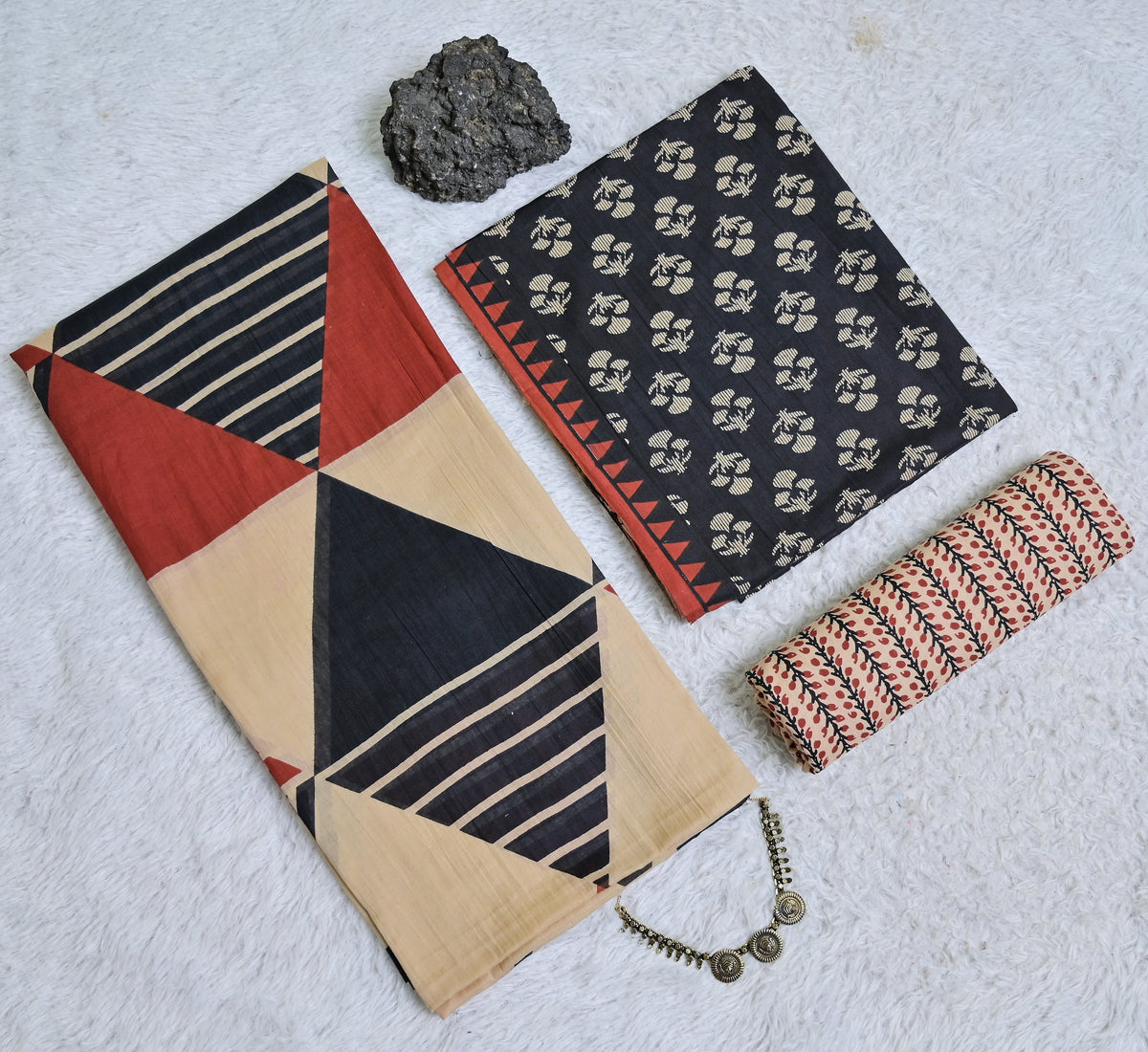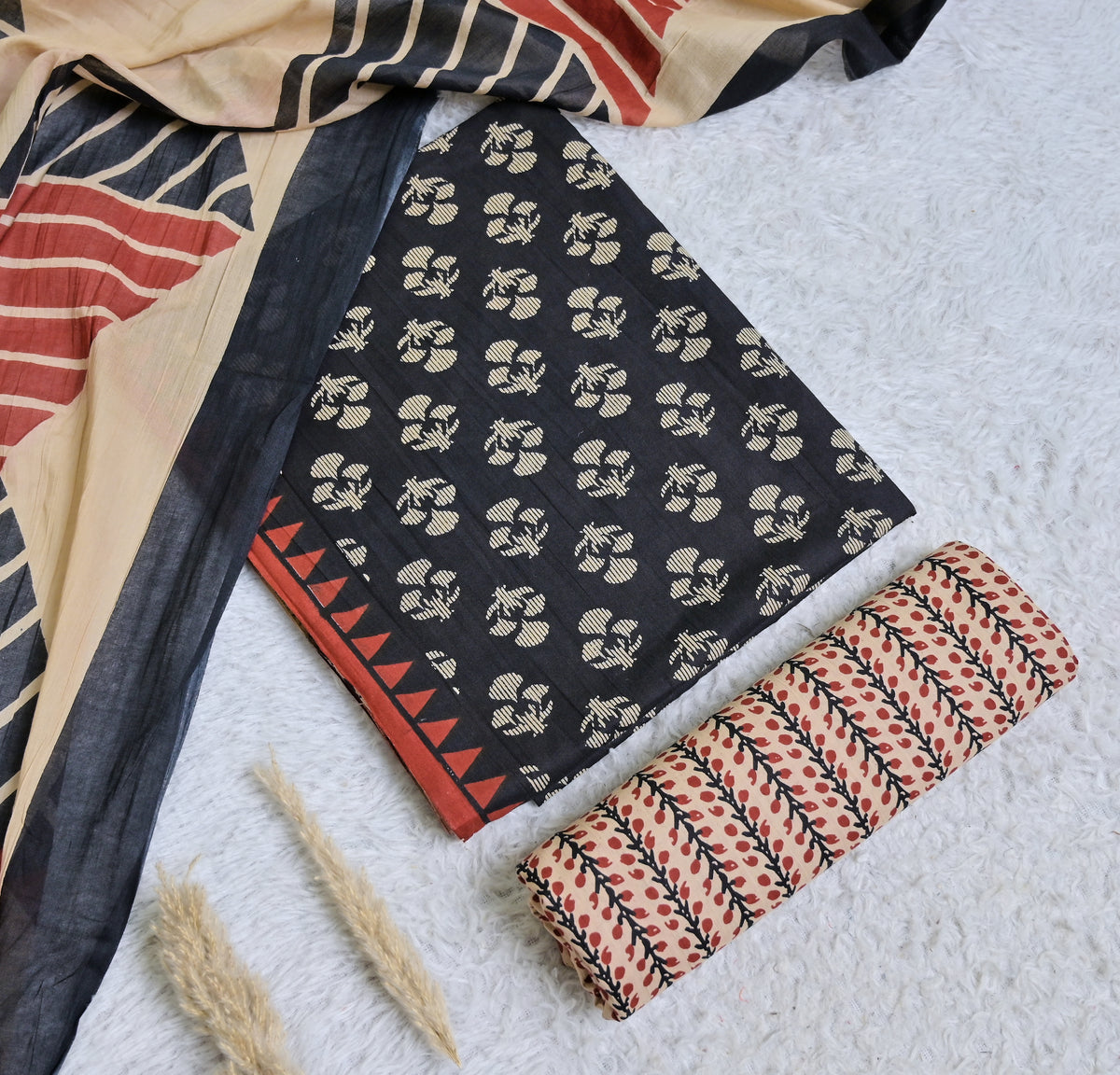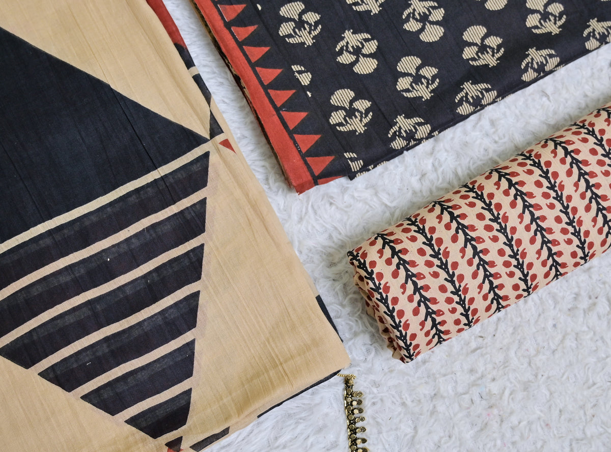 Black and Beige Printed Cotton 3-Piece Unstitched Dress Material AJ102