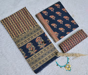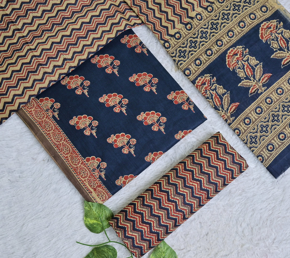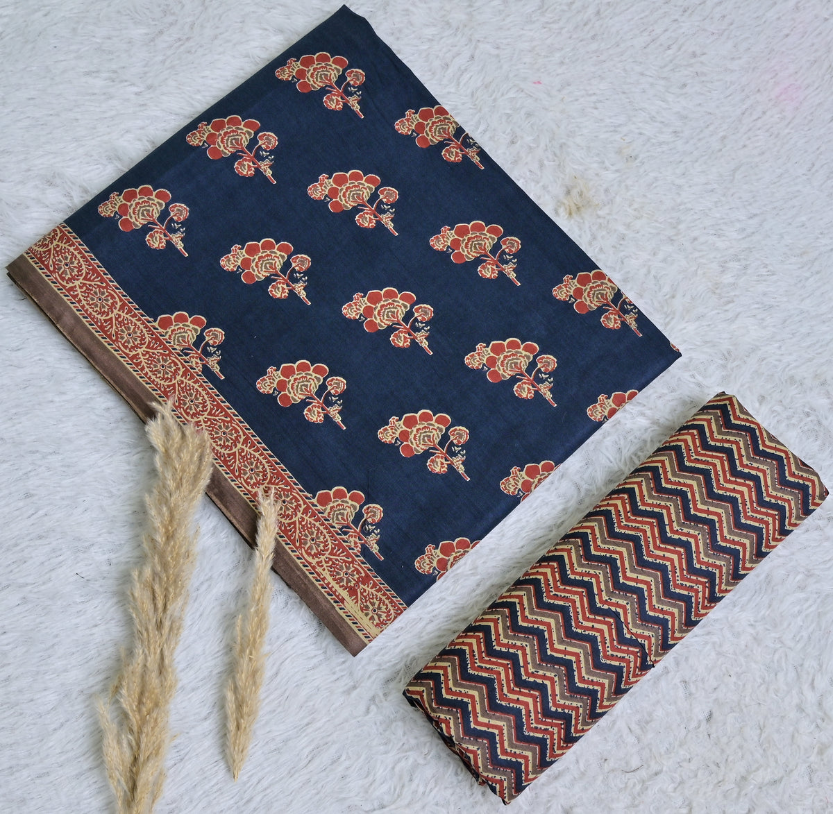 Upgrade your daily ethnic collection with this classic indigo and rust unstitched dress material. This 3-piece set is crafted from breathable cotton, featuring a timeless combination of floral and geometric patterns. The kurta fabric is designed with elegant rust-toned floral motifs on a deep indigo base, accented by a detailed floral border.