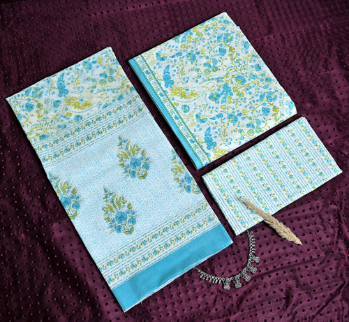 Bring easy everyday elegance to your wardrobe with this printed cotton 3-piece unstitched dress material set. The kurta fabric features a floral print in lavender tones balanced with cream highlights, giving it a fresh, wearable look. The matching pant fabric keeps the set coordinated, while the printed dupatta adds contrast through stripe detailing for a complete finish.